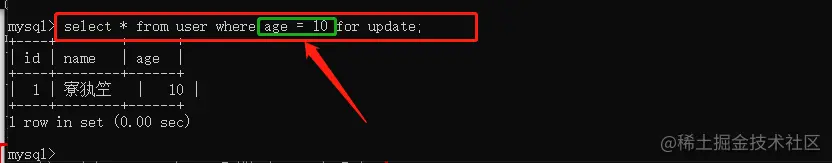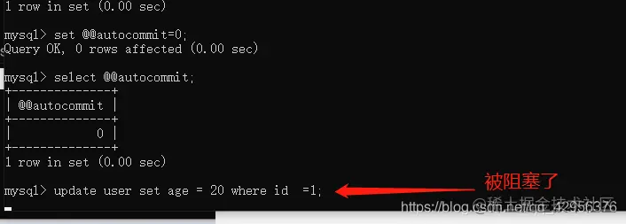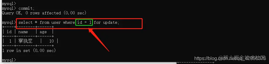 使用主键id为条件去查询,然后开启另一个事务去更新数据,更新被阻塞,加锁了,锁定要查询的id为1的行数据。