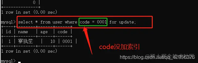 //id为主键 //name 为唯一索引 CREATE TABLE `user` ( `id` INT ( 11 ) NOT NULL AUTO_INCREMENT, `name` VARCHAR ( 255 ) DEFAULT NULL, `age` INT ( 11 ) DEFAULT NULL, `code` VARCHAR ( 255 ) DEFAULT NULL, PRIMARY KEY ( `id` ), KEY `idx_age` ( `age` ) USING BTREE ) ENGINE = INNODB AUTO_INCREMENT = 1570068 DEFAULT CHARSET = utf8