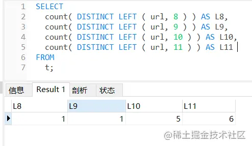 SELECT count( DISTINCT LEFT ( url, 8 ) ) AS L8, count( DISTINCT LEFT ( url, 9 ) ) AS L9, count( DISTINCT LEFT ( url, 10 ) ) AS L10, count( DISTINCT LEFT ( url, 11 ) ) AS L11 FROM t;