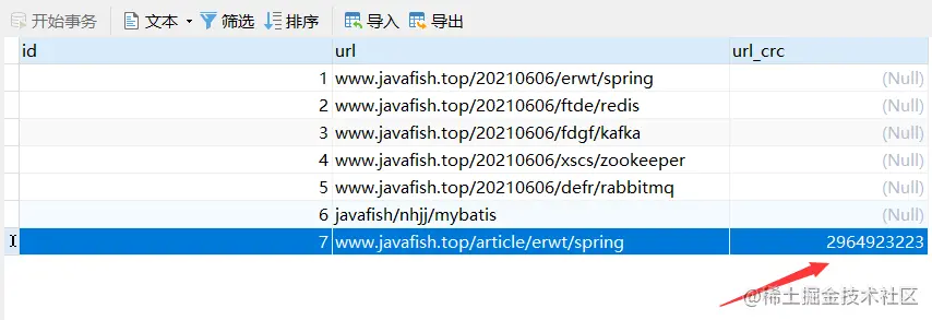 INSERT INTO t VALUE( 00000000007, 'wwww.javafish.top/article/erwt/spring', CRC32('wwww.javafish.top/article/erwt/spring'))