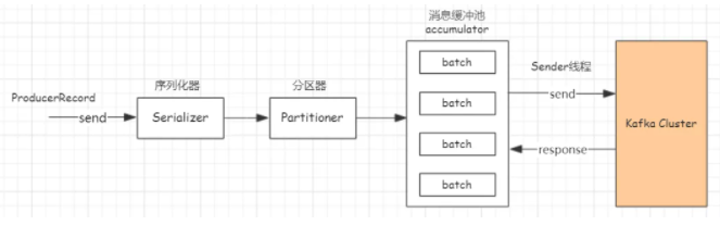 Kafka 自从 0.8.2 版本就引入了新版本 Producer API,新版 Producer 完全是采用异步方式发送消息。生产端构建的 ProducerRecord 先是经过 keySerializer、valueSerializer 序列化后,再是经过 Partition 分区器处理,决定消息落到 topic 具体某个分区中,最后把消息发送到客户端的消息缓冲池 accumulator 中,交由一个叫作 Sender 的线程发送到 broker 端。