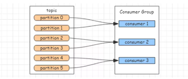 Consumer:消费者,拉取消息进行消费。 一个 topic 可以让若干个消费者进行消费,若干个消费者组成一个 Consumer Group 即消费组,一条消息只能被消费组中一个 Consumer 消费。