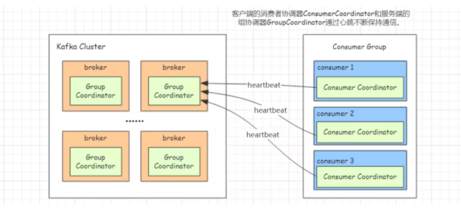 客户端的消费者协调器 Consumer Coordinator 和服务端的组协调器 Group Coordinator 会通过心跳不断保持通信。
