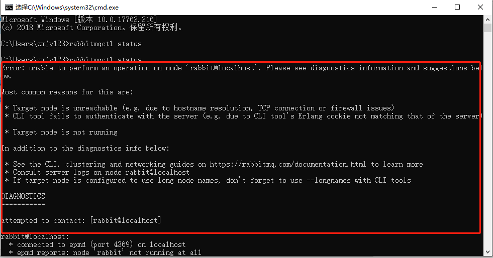 - 以管理员身份打开cmd输入rabbitmqctl status,提示 unable to perform an operation on node 'rabbit@localhost'错误