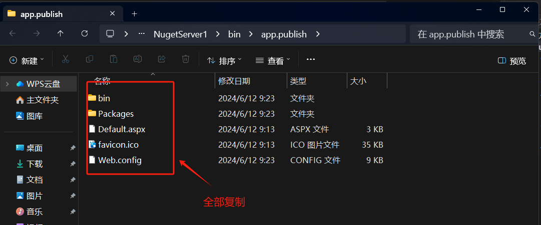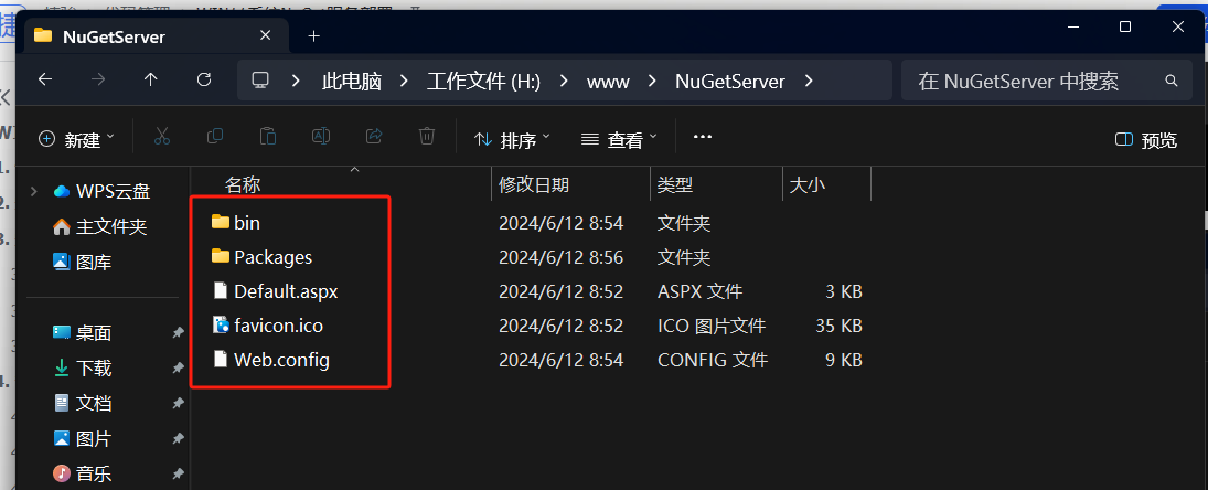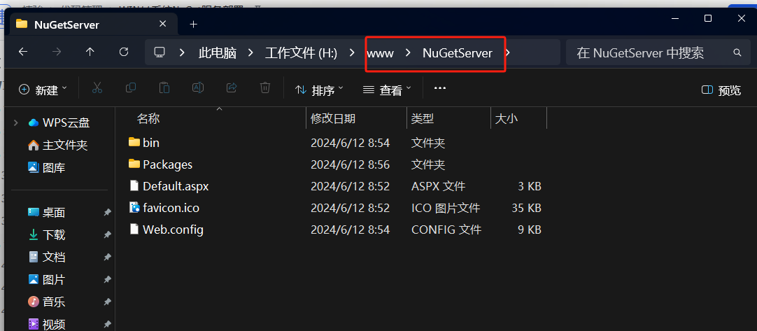 在H盘(可任意盘符)创建一个www文件夹,再新建个NuGetServer文件夹,复制上一步发布的文件到NuGetServer文件夹,如图所示