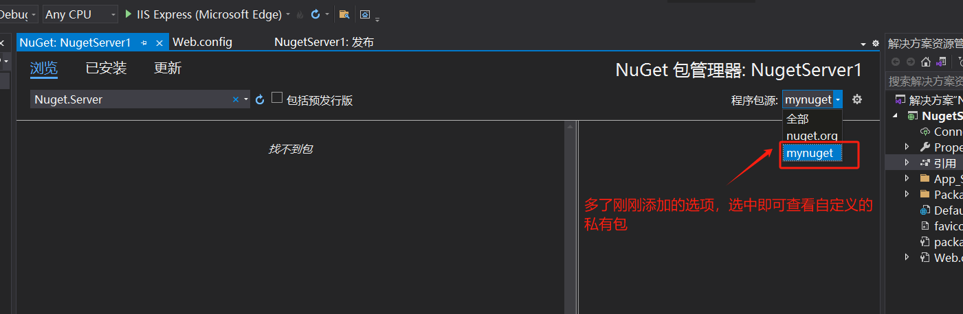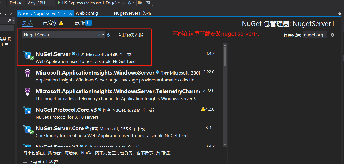 NuGet.Server包,不能直接在nuget包管理器下载安装,否则网站部署完成后,网页是可以正常访问,但是vs访问不了。