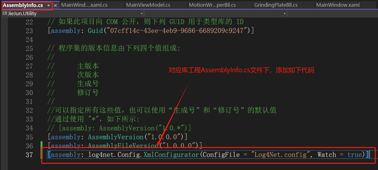 把XmlConfigurator.Configure(new FileInfo("Log4Net.config"));这行注释掉,在AssemblyInfo.cs文件中添加一行,如下: