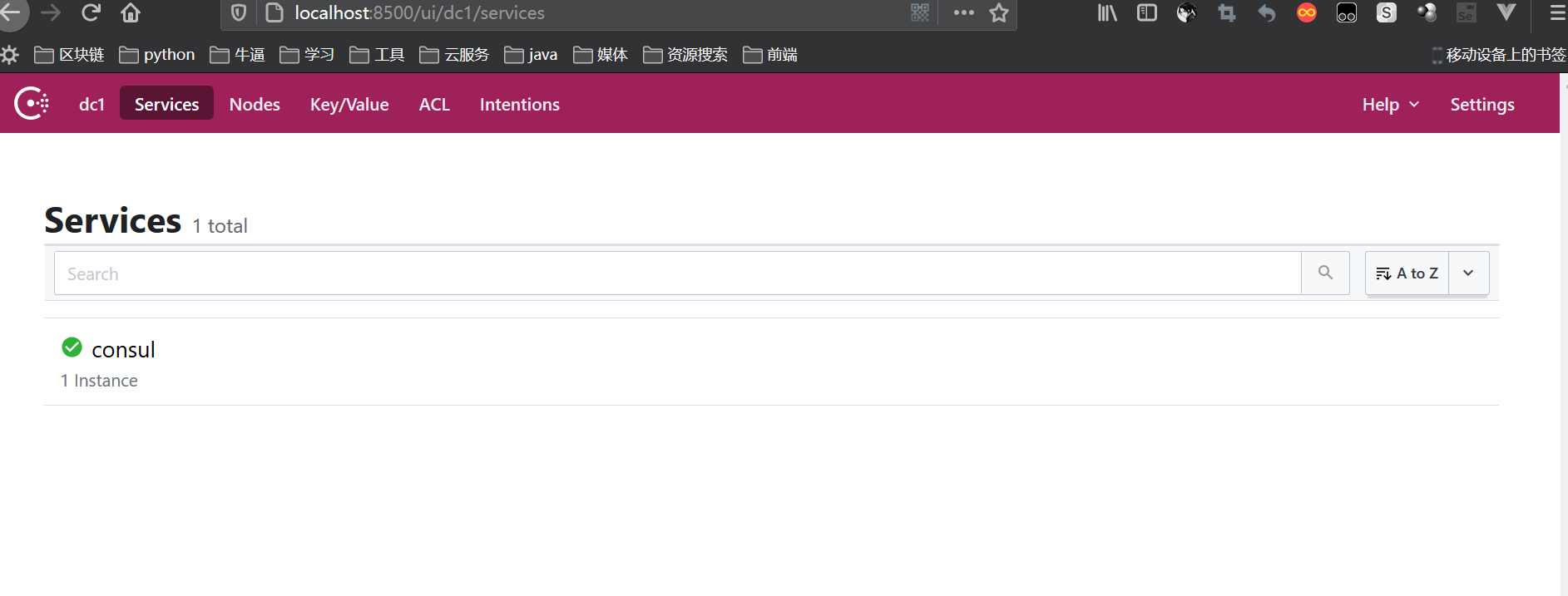 启动成功后,在物理机中,我们可以直接访问 Consul 的后台管理页面(注意,这个访问要确保 8500