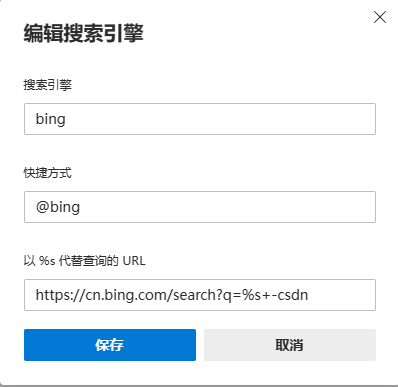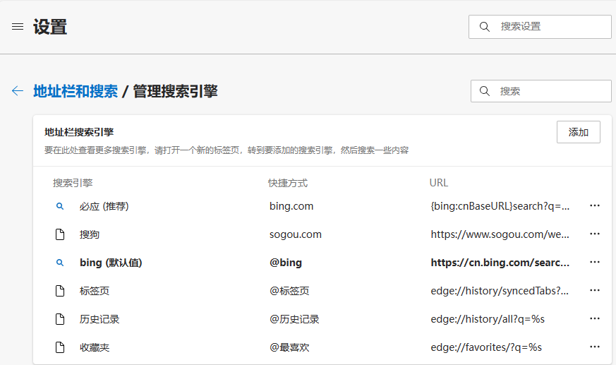 在bing上搜索计算机相关内容,前两页csdn能占十之七八九,内容能参考的十之一二,毕竟还能看,这回csdn呱噪地把顶部广告栏直接加到页面的三有其一,翻看内容很不适,意思就是不登录就别看了,没辙,还是得屏蔽。因之前就屏蔽过一次,重装系统后没加上,这回照着旧路子再走一遍,edge点设置->隐私,搜索和服务,拉到最下,点地址栏和搜索,在管理搜索引擎那里添加新的必应,咦,怎么不能新增的不能设置默认了呢,看看旧必应和搜狗等,点击三个点是有设置默认可以选的,一时也想不起漏了什么,只得一个一个对比,删了增,增了删,发现快捷方式那必须加上@才成,或许以前的操作有加,日久忘矣,之志免得再忘。