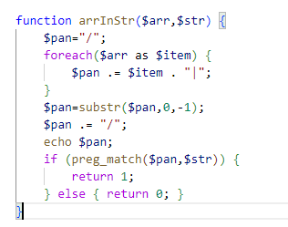 php怎样简易地判断字符串是否包含数组中的元素呢,折腾了一晌未果。从php内置的字符串函数和数组函数,没见到直接的方法,只有自行循环判断。