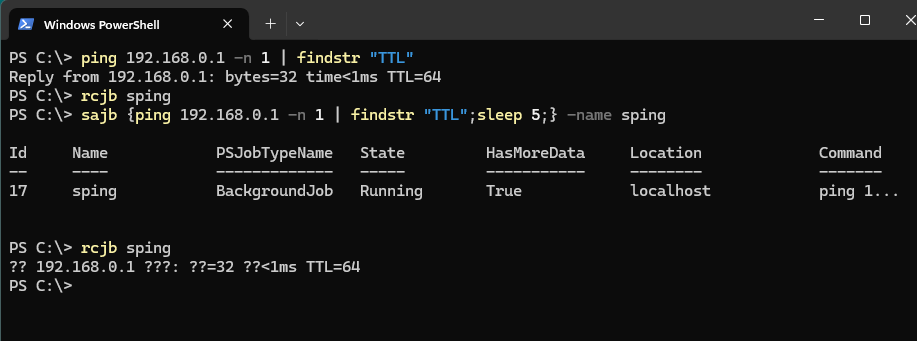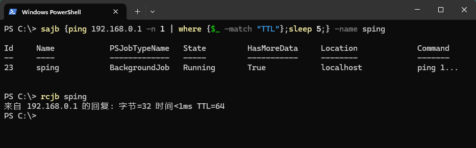 加入start-job是为了隔一定时间获取输出,这个例子演示了ping对网关的连接稳定测定