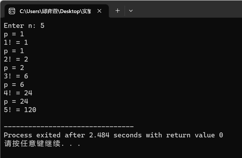 //利用局部static变量的特性,计算阶乘 #include <stdio.h> long long fac(int n); int main() { int i, n; printf("Enter n: "); scanf("%d", &n); for(i = 1; i <= n; ++i) printf("%d! = %lld\n", i, fac(i)); return 0; } //函数定义 long long fac(int n) { static long long p = 1; printf("p = %lld\n", p); p = p*n; return p; }