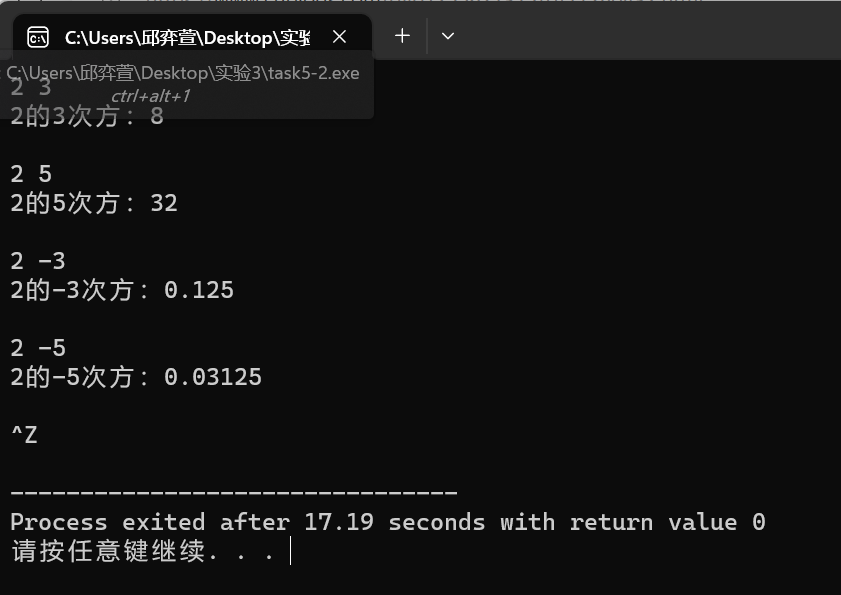 #include <stdio.h> double mypow(int x, int y); //函数声明 int main() { int x, y; double ans; while(scanf("%d%d", &x, &y) != EOF) { ans = mypow(x, y); //函数调用 printf("%d的%d次方:%g\n\n", x, y, ans); } return 0; } //函数定义 double mypow(int x, int y) { int i; double ans=1; if(x==1||y==0) ans = 1; if(y > 0){ for(i = 1; i <= y; ++i) ans = ans*x;} if(y < 0){ for(i = -1; i >= y; --i) ans = ans/x;} return ans; }