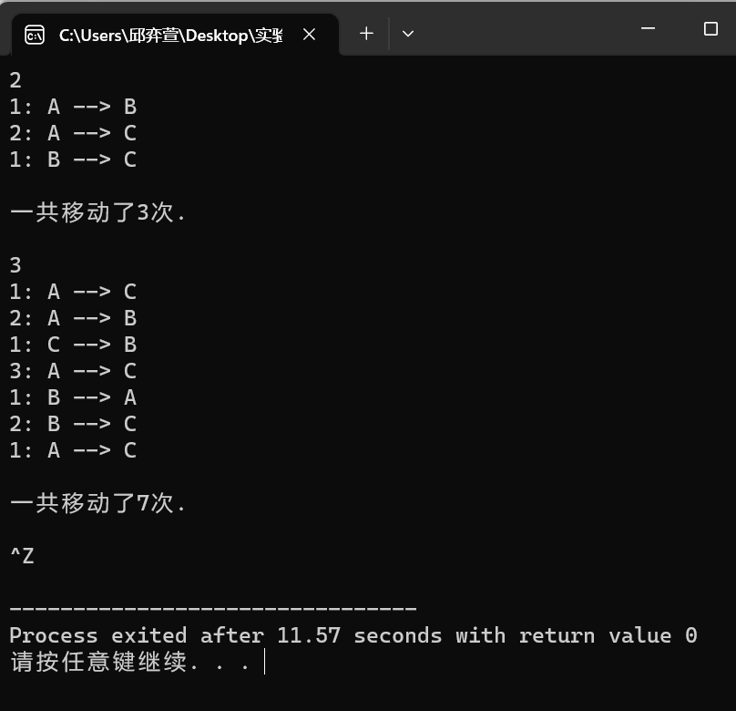 #include <stdio.h> void hanoi(unsigned int n, char form, char temp, char to); void moveplate(unsigned int n, char from, char to); int count = 0; int main() { unsigned int n; int count1=0; while(scanf("%u", &n)!=EOF){ count = count - count1; hanoi(n, 'A', 'B', 'C'); printf("\n"); printf("一共移动了%d次.\n\n", count); count1 = count; } return 0; } //递归函数 void hanoi(unsigned int n, char from, char temp, char to){ if(n==1) moveplate(n, from, to); else { hanoi(n-1, from, to, temp); moveplate(n, from, to); hanoi(n-1, temp, from, to); } } //移动函数 void moveplate(unsigned int n, char from, char to){ printf("%u: %c --> %c\n", n, from, to); count++; }