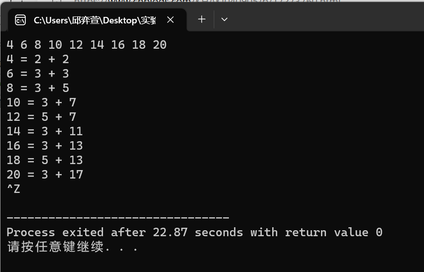 #include<stdio.h> #include<math.h> int is_prime(int a); int main() { int s, i; while(scanf("%d", &s) != EOF){ for(i=2; i<=1.0*s/2; i++){ if(is_prime(i)&&is_prime(s-i)) {printf("%d = %d + %d\n", s, i, s-i); break; } } } return 0; } int is_prime(int a){ int i, m; m = sqrt(1.0*a); for(i=2; i<=m; i++) if(a%i == 0) return 0; if(i>a) return 1; }