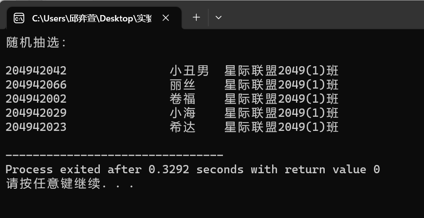 #include <stdio.h> #include <string.h> #include <stdlib.h> #include <time.h> #define N 80 #define M 100 typedef struct { long int id; char name[20]; char banji[100]; } STU; // 函数声明 void input(STU s[], int n); void output(STU s[],int n); int main() { STU stu[N]; input(stu, N); printf("随机抽选:\n"); output(stu,5); return 0; } void input(STU s[], int n) { int i; FILE *fin; fin = fopen("list.txt", "r"); if (fin == NULL) { printf("fail to open file\n"); exit(0); } while (!feof(fin)) { for (i = 0; i < n; i++) fscanf(fin, "%ld %s %s", &s[i].id, s[i].name, s[i].banji); } fclose(fin); } void output(STU s[], int n) { FILE *fout; STU t[5]; int i; int k; // 输出 printf("\n"); srand((unsigned)time(NULL)); for (i = 0; i < n; i++){ int k = (rand()%80); t[i] = s[k]; printf("%ld\t\t%s\t%s\n", s[k].id, s[k].name, s[k].banji); } // 保存 fout = fopen("lucky.txt", "w"); if (!fout) { printf("fail to open or create lucky.txt\n"); exit(0); } for (i = 0; i < n; i++) fprintf(fout, "%ld\t\t%s\t%s\n", t[i].id, t[i].name, t[i].banji); fclose(fout); }