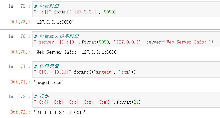 - {}表示按照顺序匹配位置参数,{n}表示取位置参数索引为n的值