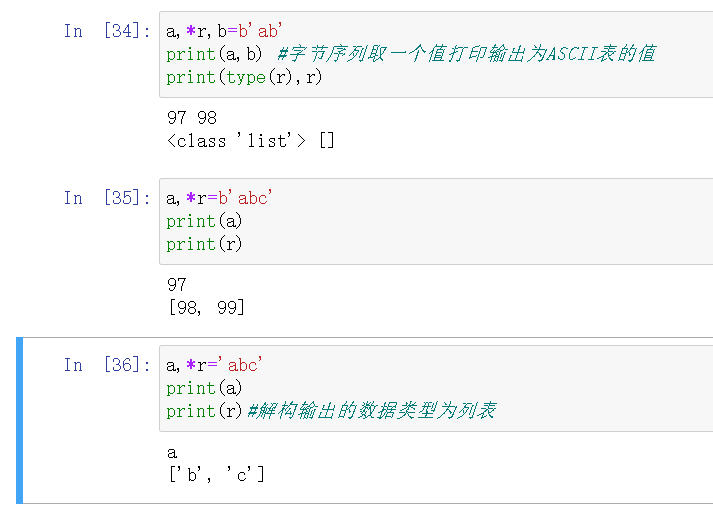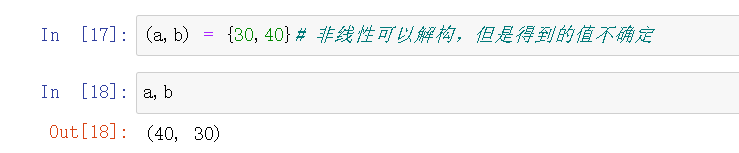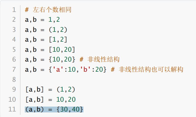 Python中等式右侧是一个容器类型,左侧是逗号分隔的多个标识符,将右侧容器中数据的一个个和左侧标识符一一对应。这种操作称为解构unpacking。