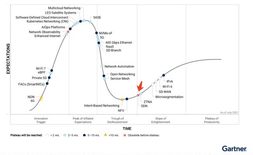 转眼到了2021年, 在Gartner发布的各种技术的成熟度曲线中,SDN却被标注成了一种Obsolete before plateau的技术,字面理解就是在达到成熟阶段并形成大量应用之前被废弃了。