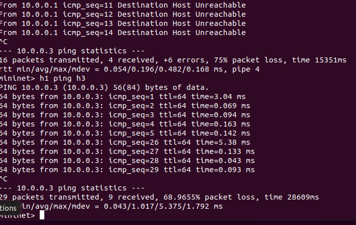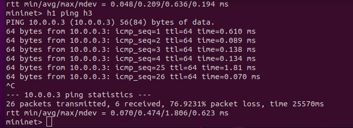 (3) 下发硬超时流表,实现拓扑内主机h1和h3网络中断20s。
