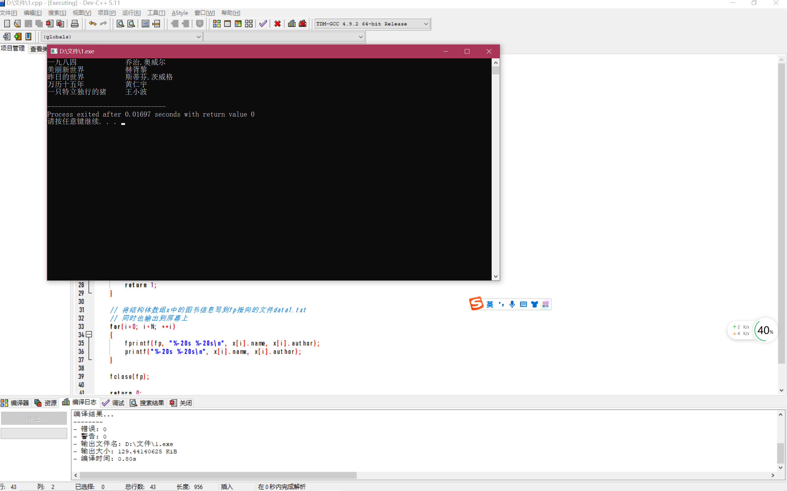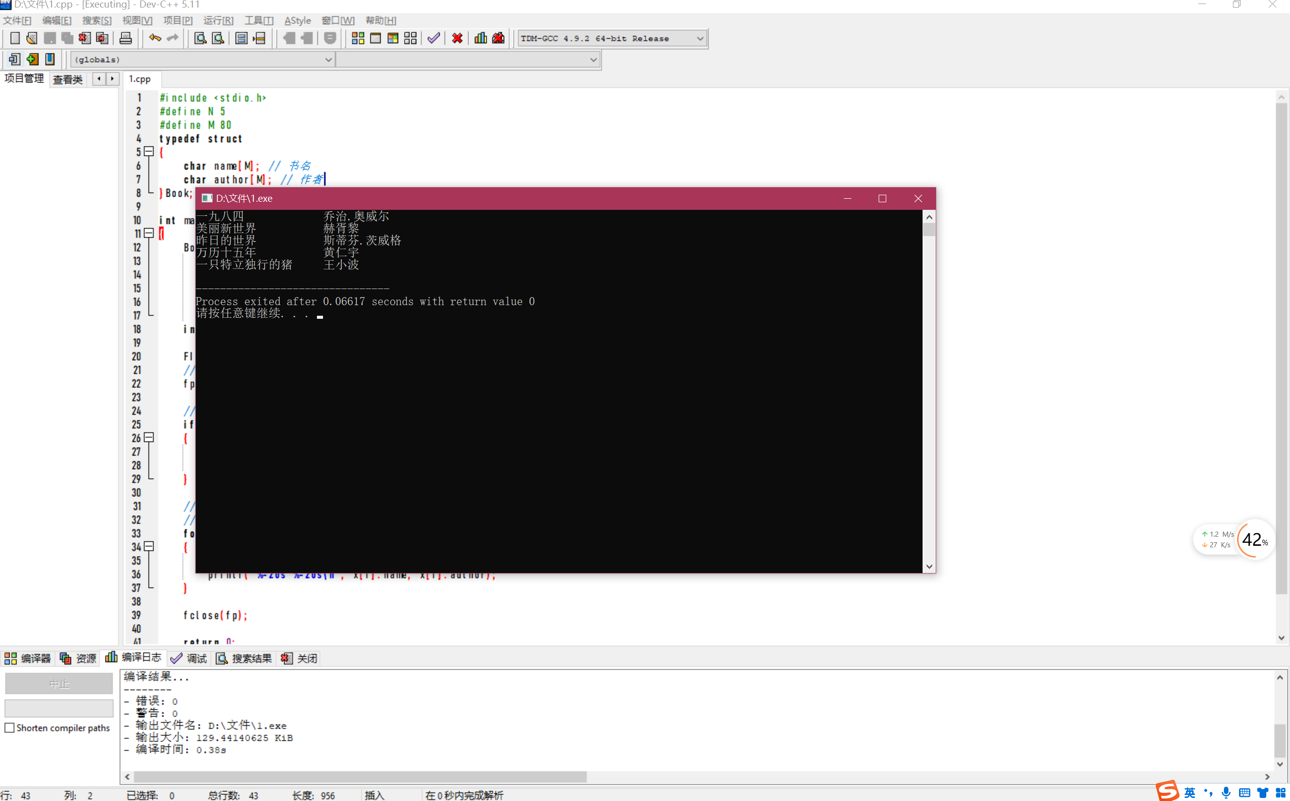 #include <stdio.h> #define N 5 #define M 80 typedef struct { char name[M]; // 书名 char author[M]; // 作者 }Book; int main() { Book x[N]={ {"一九八四", "乔治.奥威尔"}, {"美丽新世界", "赫胥黎"}, {"昨日的世界", "斯蒂芬.茨威格"}, {"万历十五年", "黄仁宇"}, {"一只特立独行的猪", "王小波"} }; int i; FILE *fp; // 以写的方式打开文本文件data1.txt fp = fopen("data1.txt", "w"); // 如果打开文件失败,输出提示信息并返回 if(fp==NULL) { printf("fail to open file\n"); return 1; } // 将结构体数组x中的图书信息写到fp指向的文件data1.txt // 同时也输出到屏幕上 for(i=0; i<N; ++i) { fprintf(fp, "%-20s %-20s\n", x[i].name, x[i].author); printf("%-20s %-20s\n", x[i].name, x[i].author); } fclose(fp); return 0; }