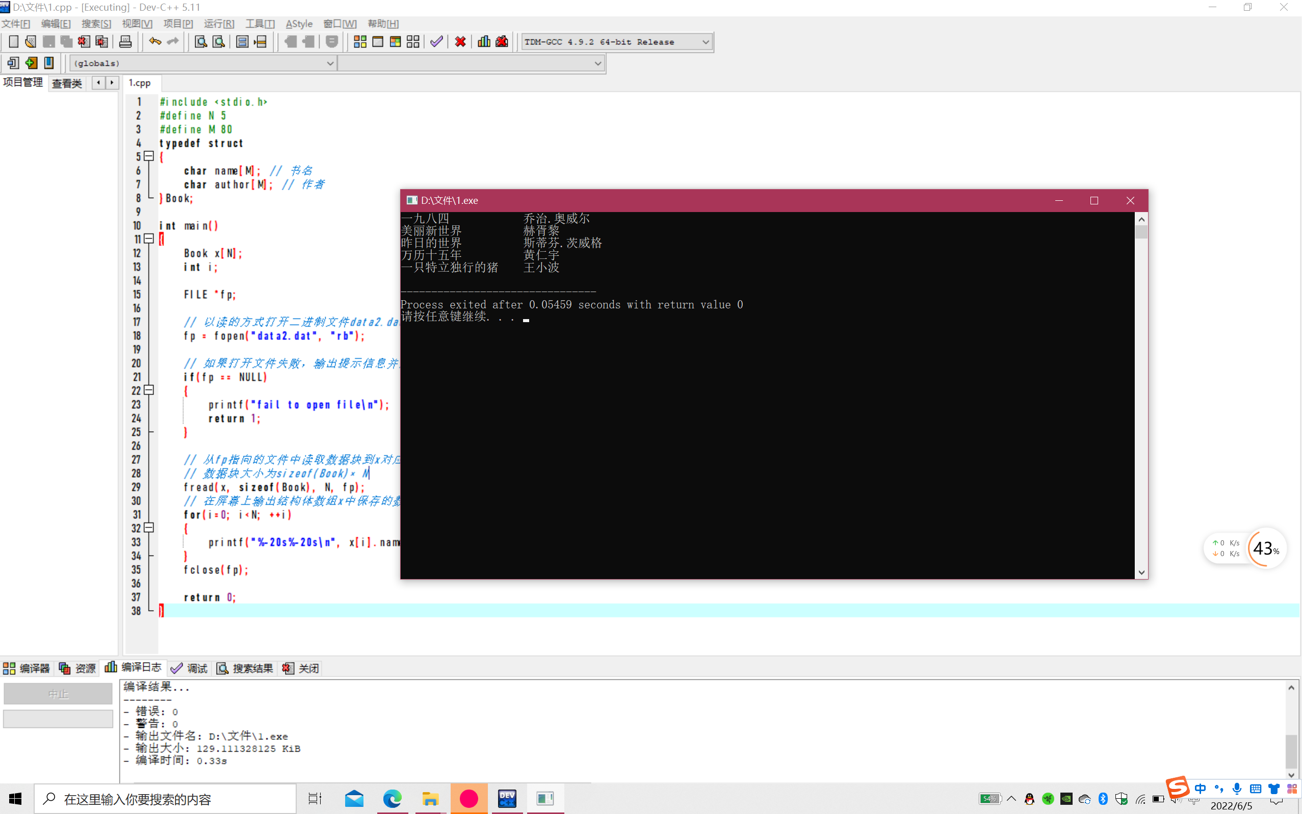 #include <stdio.h> #define N 5 #define M 80 typedef struct { char name[M]; // 书名 char author[M]; // 作者 }Book; int main() { Book x[N]={ {"一九八四", "乔治.奥威尔"}, {"美丽新世界", "赫胥黎"}, {"昨日的世界", "斯蒂芬.茨威格"}, {"万历十五年", "黄仁宇"}, {"一只特立独行的猪", "王小波"} }; int i; FILE *fp; // 以写的方式打开二进制文件data1.txt fp = fopen("data2.dat", "wb"); // 如果打开文件失败,输出提示信息并返回 if(fp==NULL) { printf("fail to open file\n"); return 1; } // 将结构体数组x中的图书信息写以数据块方式写入文件 // 把从地址x处开始sizeof(Book)×N个字节大小的数据块写入fp指向的文件 fwrite(x, sizeof(Book), N, fp); fclose(fp); return 0; }