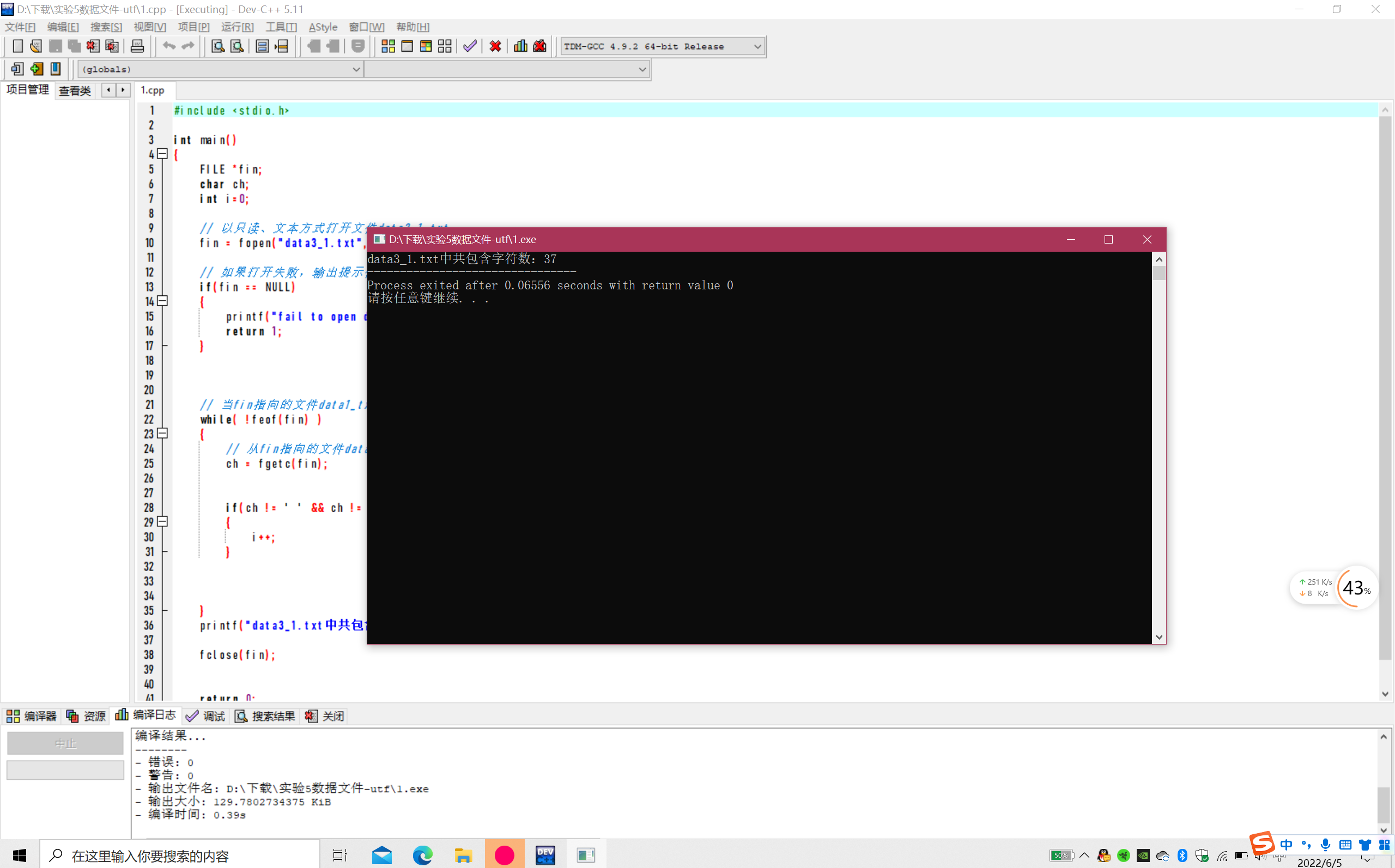 #include <stdio.h> int main() { FILE *fin; char ch; int i=0; // 以只读、文本方式打开文件data3_1.txt fin = fopen("data3_1.txt", "r"); // 如果打开失败,输出提示信息并返回 if(fin == NULL) { printf("fail to open data3_1.txt\n"); return 1; } // 当fin指向的文件data1_txt没有结束时 while( !feof(fin) ) { // 从fin指向的文件data1_txt读取单个字符 ch = fgetc(fin); if(ch != ' ' && ch != '\n' && ch != '\t') { i++; } } printf("data3_1.txt中共包含字符数:%d",i); fclose(fin); return 0; }