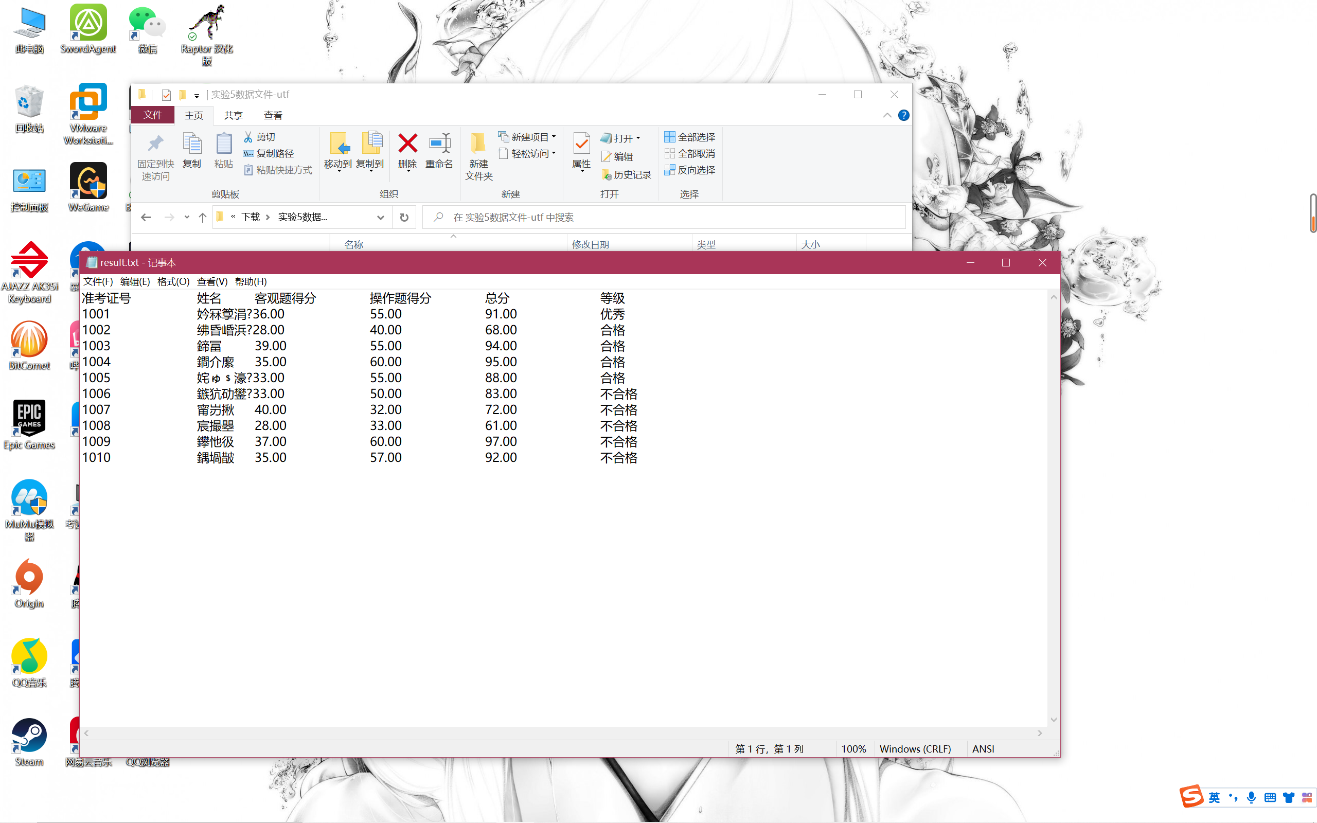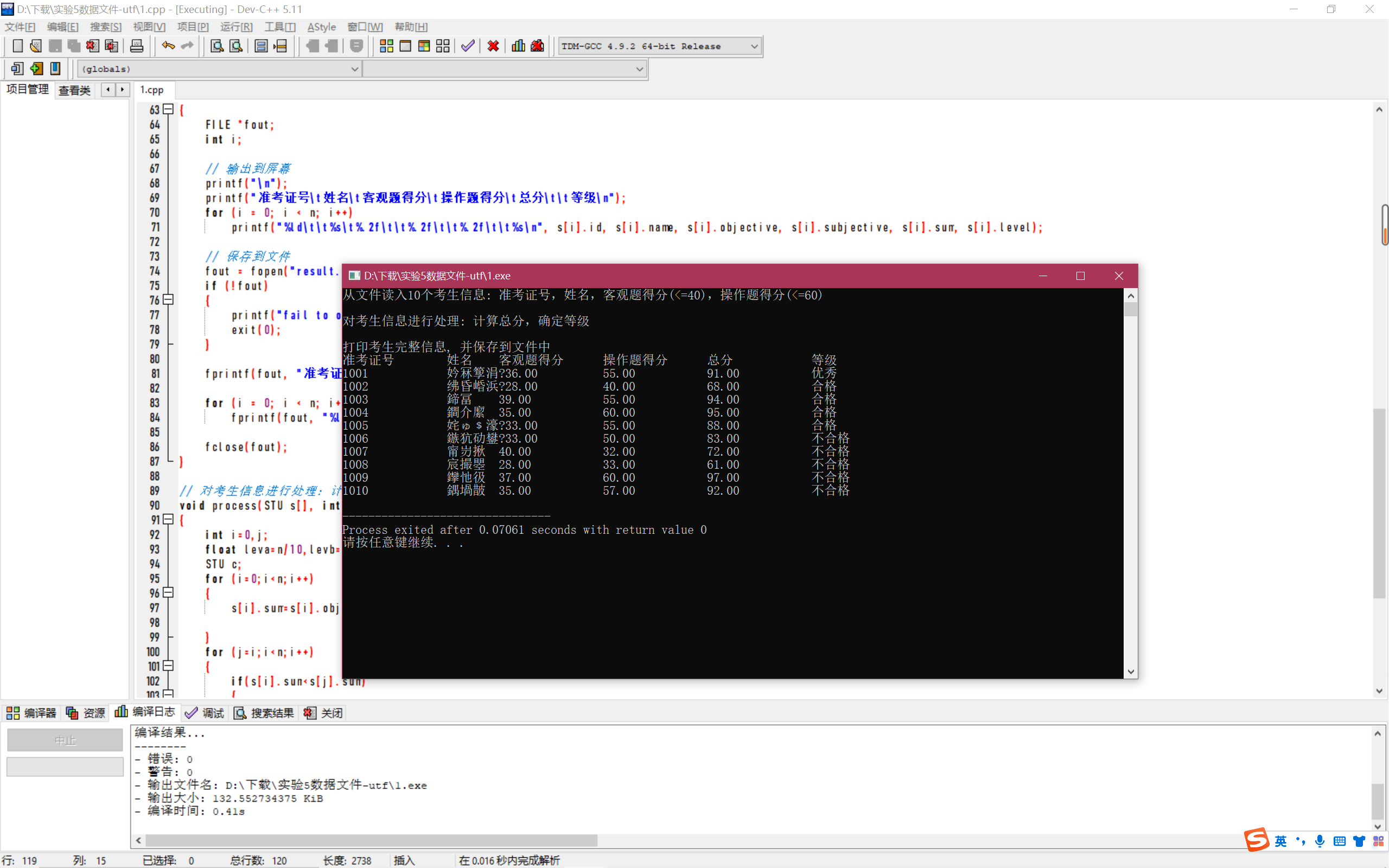 #include <stdio.h> #include <string.h> #include <stdlib.h> #define N 10 typedef struct { long int id; char name[20]; float objective; /*客观题得分*/ float subjective; /*操作题得分*/ float sum; char level[10]; } STU; // 函数声明 void input(STU s[], int n); void output(STU s[], int n); void process(STU s[], int n); int main() { STU stu[N]; printf("从文件读入%d个考生信息: 准考证号,姓名,客观题得分(<=40),操作题得分(<=60)\n", N); input(stu, N); printf("\n对考生信息进行处理: 计算总分,确定等级\n"); process(stu, N); printf("\n打印考生完整信息, 并保存到文件中"); output(stu, N); return 0; } // 从文本文件examinee.txt读入考生信息:准考证号,姓名,客观题得分,操作题得分 void input(STU s[], int n) { int i; FILE *fin; fin = fopen("examinee.txt", "r"); if (fin == NULL) { printf("fail to open file\n"); exit(0); } while (!feof(fin)) { for (i = 0; i < n; i++) fscanf(fin, "%ld %s %f %f", &s[i].id, s[i].name, &s[i].objective, &s[i].subjective); } fclose(fin); } //输出考生完整信息: 准考证号,姓名,客观题得分,操作题得分,总分,等级 // 不仅输出到屏幕上,还写到文本文件result.txt中 void output(STU s[], int n) { FILE *fout; int i; // 输出到屏幕 printf("\n"); printf("准考证号\t姓名\t客观题得分\t操作题得分\t总分\t\t等级\n"); for (i = 0; i < n; i++) printf("%ld\t\t%s\t%.2f\t\t%.2f\t\t%.2f\t\t%s\n", s[i].id, s[i].name, s[i].objective, s[i].subjective, s[i].sum, s[i].level); // 保存到文件 fout = fopen("result.txt", "w"); if (!fout) { printf("fail to open or create result.txt\n"); exit(0); } fprintf(fout, "准考证号\t\t姓名\t客观题得分\t操作题得分\t总分\t\t等级\n"); for (i = 0; i < n; i++) fprintf(fout, "%ld\t\t%s\t%.2f\t\t%.2f\t\t%.2f\t\t%s\n", s[i].id, s[i].name, s[i].objective, s[i].subjective, s[i].sum, s[i].level); fclose(fout); } // 对考生信息进行处理:计算总分,排序,确定等级 void process(STU s[], int n) { int i,j; STU t; for(i=0;i<n;i++) { s[i].sum=(s[i].objective)+(s[i].subjective); } for(j=0;j<n-1;j++) for(i=0;i<n-j-1;i++) if(s[i].sum<s[i+1].sum) { t=s[i]; s[i]=s[i+1]; s[i+1]=t; } for(i=0;i<1;i++) { strcpy( s[i].level,"优秀"); } for(;i>=1&&i<5;i++) strcpy(s[i].level,"合格"); for(;i<n;i++) strcpy(s[i].level,"不合格"); }
