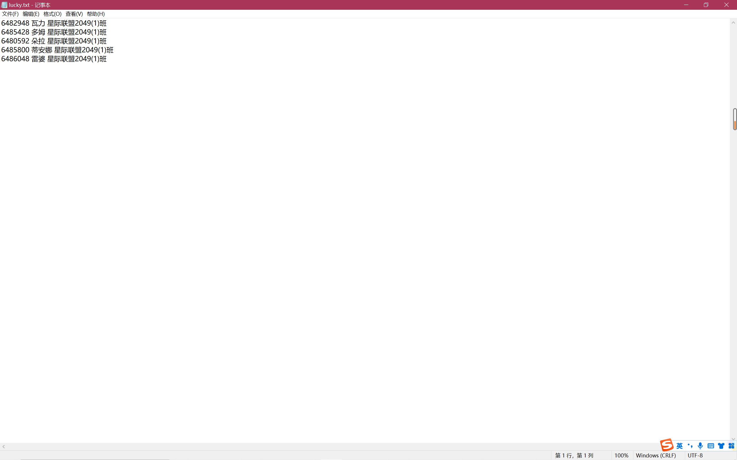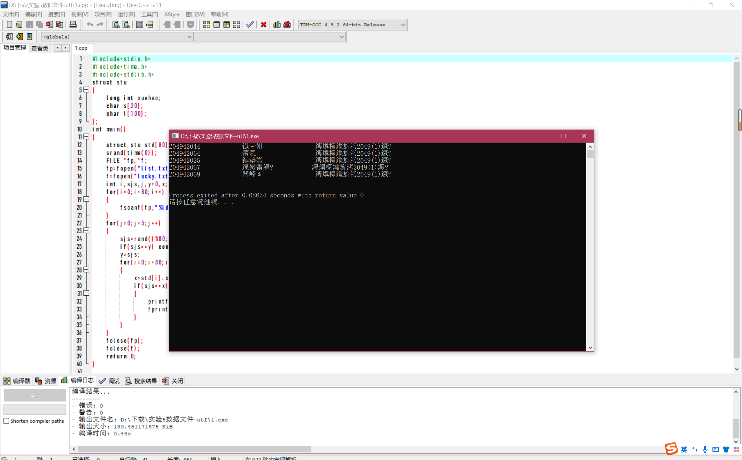 #include <stdio.h> #include <stdlib.h> #include <time.h> #define N 80 #define M 5 typedef struct { long int id; char name[20]; char banji[60]; }STU; int main() { int i,j; STU x[N],ran[M]; FILE *fin,*fout; fin = fopen("list.txt","r"); if(fin == NULL) { printf("fail to open list.txt\n"); return 1; } for(i=0;i<N;i++) { fscanf(fin, "%ld %s %s", &x[i].id, x[i].name, x[i].banji); } fclose(fin); srand(time(0)); j = rand()%(80)+1; for(i=0;i<M;i++) { ran[i] = x[j]; j = rand()%(80)+1; } fout = fopen("lucky.txt", "w"); if(fout == NULL) { printf("fail to open file\n"); return 1; } for(i=0;i<M;i++) { fprintf(fout, "%ld %s %s\n", ran[i].id, ran[i].name, ran[i].banji); printf("%ld %s %s\n", ran[i].id, ran[i].name, ran[i].banji); } fclose(fout); return 0; }