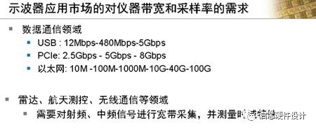 如果一个ADC的采样频率为5G,但是前面搞一个100M的低通滤波器,那采样 率就是5G,带宽就是100M了。带宽反映了这个示波器能够测试的频率范围,如果超过这个频率范围,就不准确了。