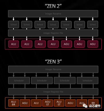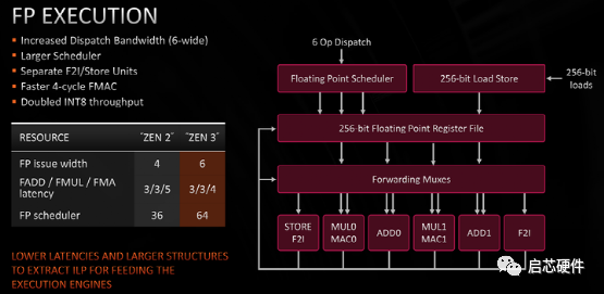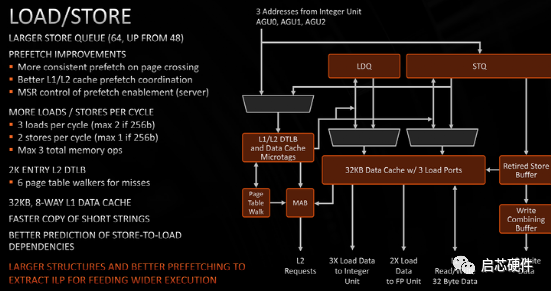 从图中可以看出 Zen3 是发射后读寄存器堆,所以这里的 scheduler 大小指的应该是 issue queue 的大小,4 个分布式的 issue queue,总大小 96 项,这边除了增大 ROB、寄存器堆之外的一个主要改动是把 7 issue 改成了 10 issue,增加的三个分别是一个 BR + 两个 STD,branch 和 store data都只需要读寄存器,不需要写寄存器,所以这里的修改不会增加处理器中 bypass 网络和寄存器堆的写口数,能以较小的开销提升处理器性能。