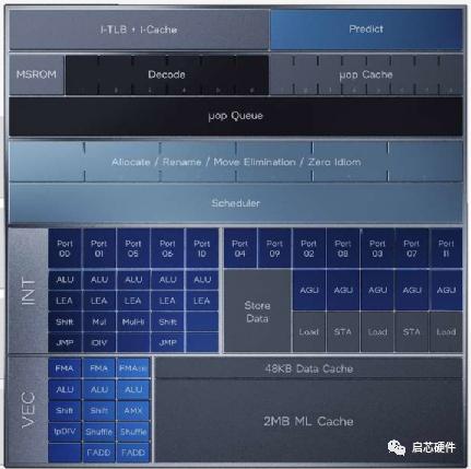 在core的架构中,基于Intel之前几代的经验,数据中心的workloads中代码有很大的footprint,并受到前端性能的限制,因此Intel重新设计了前端以解决这类瓶颈。 此外core中有多项改进例如VM拒绝保护服务、增强的Cache包括每个core私有的2MB L2 Cache和多用户的新TLB QoS功能,为了给多用户使用的情况下提供一致的性能。