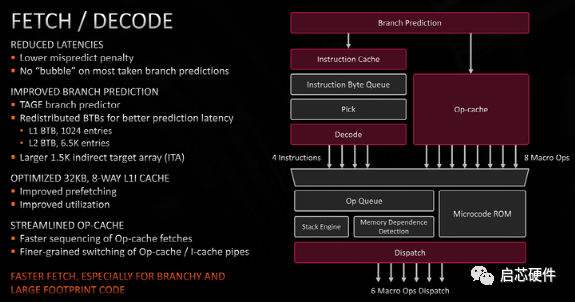 从这张图里能看出Zen3的前端采用了 decoupled 结构,先 bp 再取指,有效减少了前端的取指空泡数量,分支预测方面,加入了 Tage 预测器,增大了间接跳转预测器容量,Icache 增强了预取和利用率,micro op cache 方面提升了取指速度,并能细粒度的在 op cache 和 Icache 之间切换。减少前端的取指空泡能提升分支指令较多的程序的性能,提升间接跳转预测器容量能对 large footprint 的程序带来很好的提升,因此 AMD 强调了 "especially for branchy and large footprint code"。