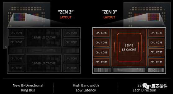 Zen2是8个核分2组,每组只能访问16MB的L3,Zen3为L3加了个环形总线,8个核可以无差别的共享32MB的L3。