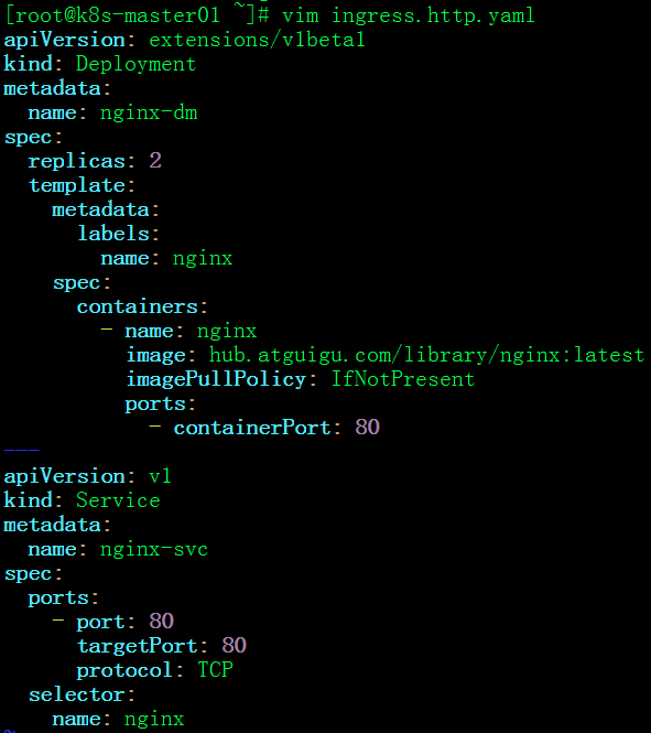 #vim ingress.http.yaml apiVersion: extensions/v1beta1 kind: Deployment metadata: name: nginx-dm spec: replicas: 2 template: metadata: labels: name: nginx spec: containers: - name: nginx image: hub.atguigu.com/library/nginx:latest imagePullPolicy: IfNotPresent ports: - containerPort: 80 --- apiVersion: v1 kind: Service metadata: name: nginx-svc spec: ports: - port: 80 targetPort: 80 protocol: TCP selector: name: nginx