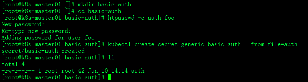 #cd basic-auth #htpasswd -c auth foo #文件名为auth,用户名为foo #kubectl create secret generic basic-auth --from-file=auth