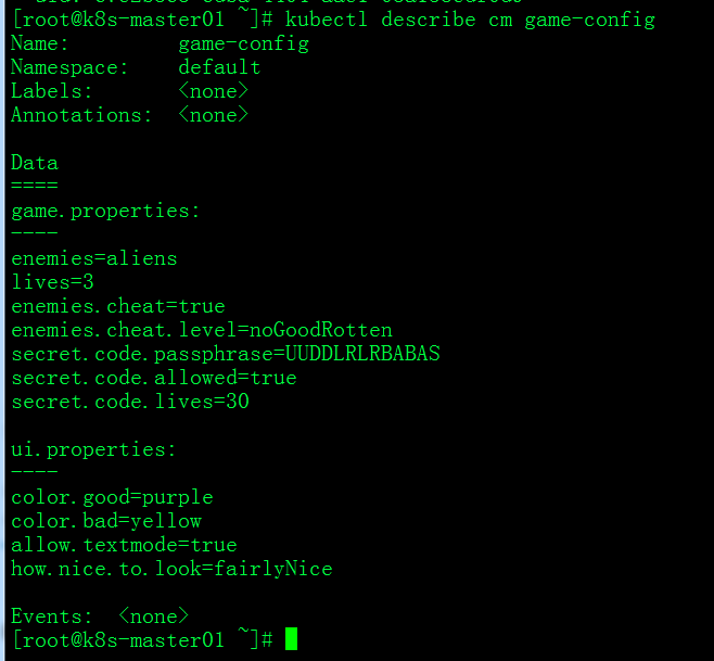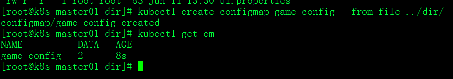 #cd ~ #mkdir configmap #cd configmap #mkdir dir #cd dir #vim game.properties enemies=aliens lives=3 enemies.cheat=true enemies.cheat.level=noGoodRotten secret.code.passphrase=UUDDLRLRBABAS secret.code.allowed=true secret.code.lives=30 #vim ui.properties color.good=purple color.bad=yellow allow.textmode=true how.nice.to.look=fairlyNice #ll /root/configmap/dir #kubectl create configmap game-config --from-file=../dir/ #指定name为game-config #kubectl get cm