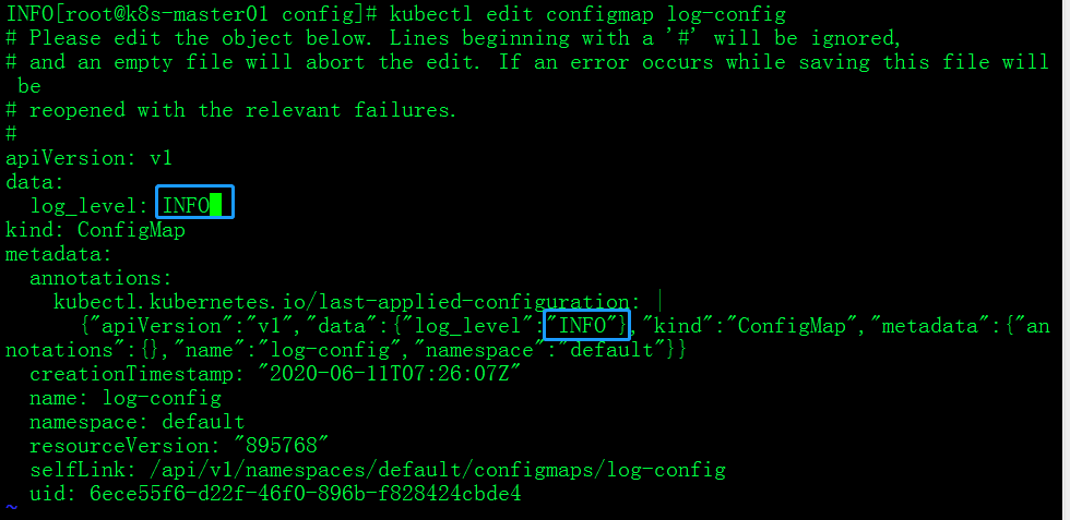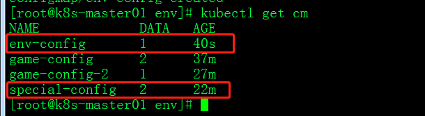 #cd /root/configmap #mkdir env #cd env #vim env.yaml apiVersion: v1 kind: ConfigMap metadata: name: env-config #指定name为env-config namespace: default data: log_level: INFO #kubectl apply -f env.yaml #kubectl get cm