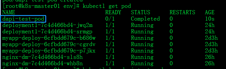 #vim pod1.yaml apiVersion: v1 kind: Pod metadata: name: dapi-test-pod1 spec: containers: - name: test-container image: hub.atguigu.com/library/nginx:latest command: ["/bin/sh", "-c", "echo $(SPECIAL_LEVEL_KEY) $(SPECIAL_TYPE_KEY)"] #输出环境变量 env: #第一种导入方案 - name: SPECIAL_LEVEL_KEY #自定义一个新的KEY字 valueFrom: configMapKeyRef: name: special-config #从那个configMap文件导入 key: special.how #导入的是那个键的键名,就是将special.how键的键值赋予 - name: SPECIAL_TYPE_KEY valueFrom: configMapKeyRef: name: special-config key: special.type restartPolicy: Never #kubectl create -f pod1.yaml #kubectl get pod