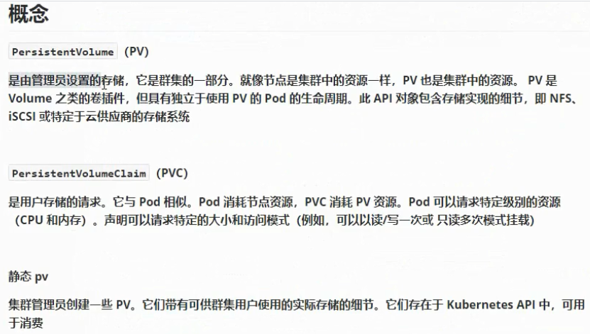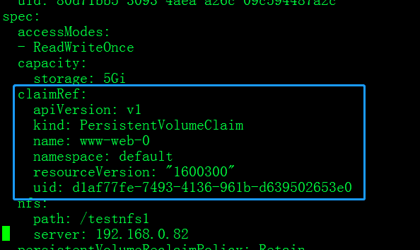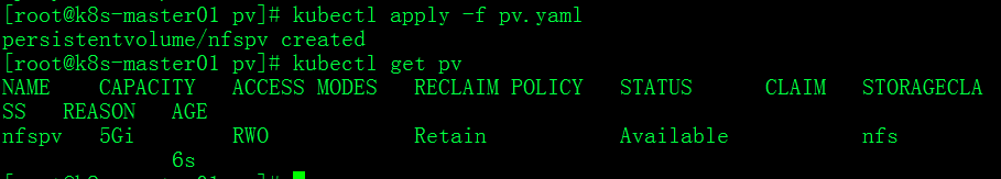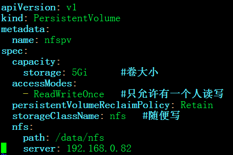 #master机器 #cd ~ #mkdir pv #cd pv #vim pv.yaml apiVersion: v1 kind: PersistentVolume metadata: name: nfspv spec: capacity: storage: 5Gi #卷大小 accessModes: - ReadWriteOnce #只允许有一个人读写 persistentVolumeReclaimPolicy: Retain storageClassName: nfs #随便写 nfs: path: /data/nfs #harbor机器磁盘目录 server: 192.168.0.82 kubectl apply -f pv.yaml