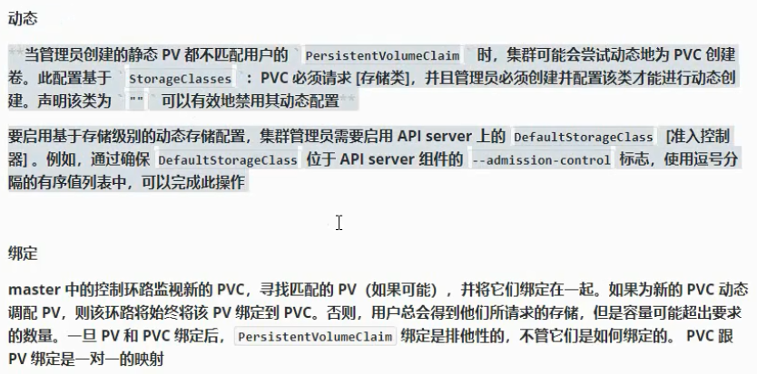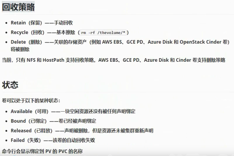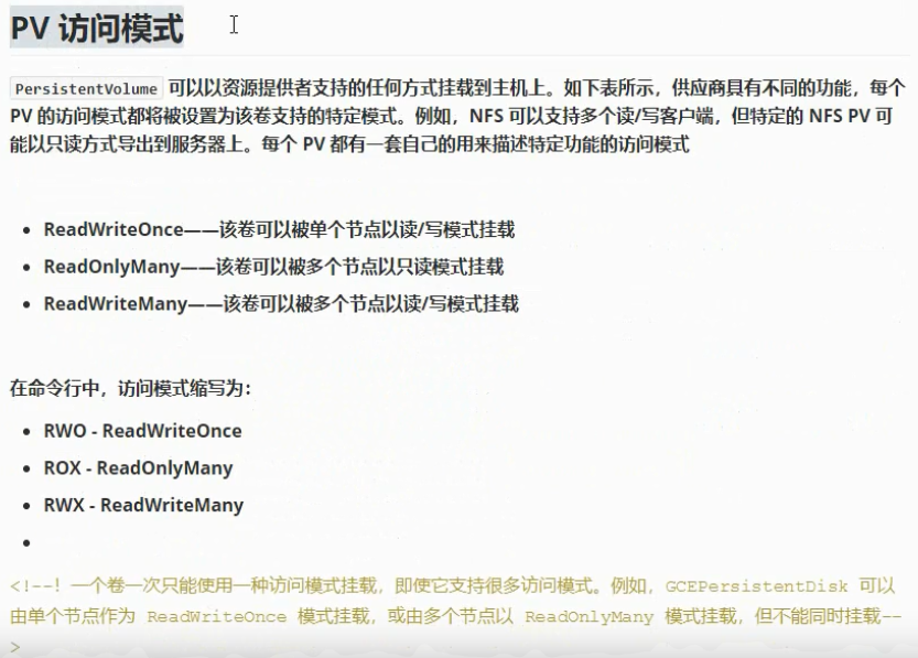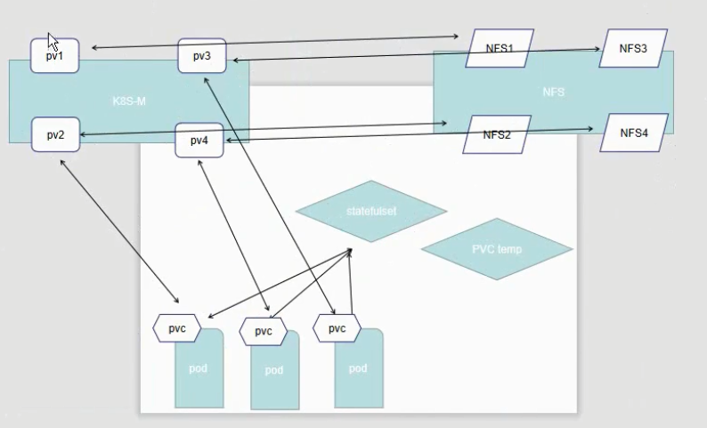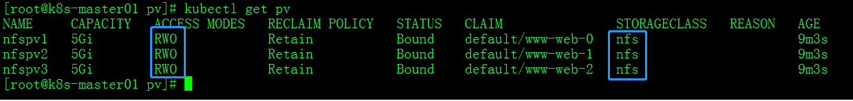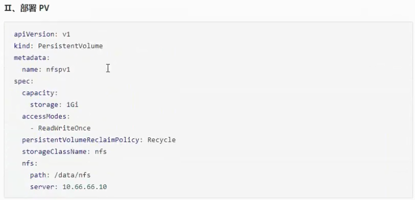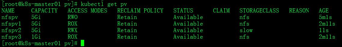 #vim pv1.yaml apiVersion: v1 kind: PersistentVolume metadata: name: nfspv1 spec: capacity: storage: 5Gi accessModes: - ReadOnlyMany => ReadWriteOnce persistentVolumeReclaimPolicy: Retain storageClassName: nfs nfs: path: /data/nfs1 server: 192.168.0.82 --- apiVersion: v1 kind: PersistentVolume metadata: name: nfspv2 spec: capacity: storage: 5Gi accessModes: - ReadWriteMany => ReadWriteOnce persistentVolumeReclaimPolicy: Retain storageClassName: slow => nfs nfs: path: /data/nfs2 server: 192.168.0.82 --- apiVersion: v1 kind: PersistentVolume metadata: name: nfspv3 spec: capacity: storage: 1Gi accessModes: - ReadOnlyMany => ReadWriteOnce persistentVolumeReclaimPolicy: Retain storageClassName: nfs nfs: path: /data/nfs3 server: 192.168.0.82