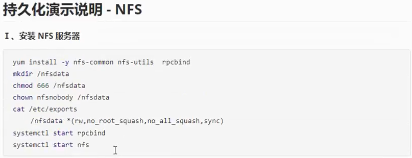 #mkdir /data/nfs #chmod 777 /nfs #chown nfsnobody /nfs #vim /etc/exports /data/nfs *(rw,no_root_squash,no_all_squash,sync)