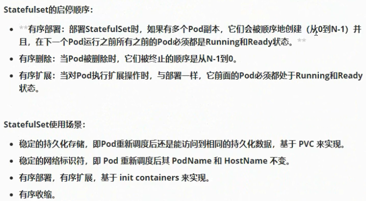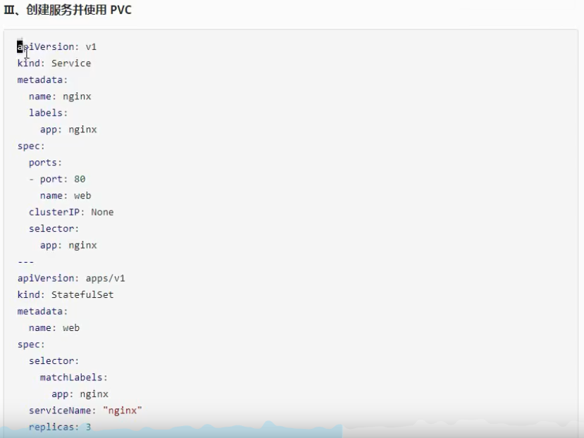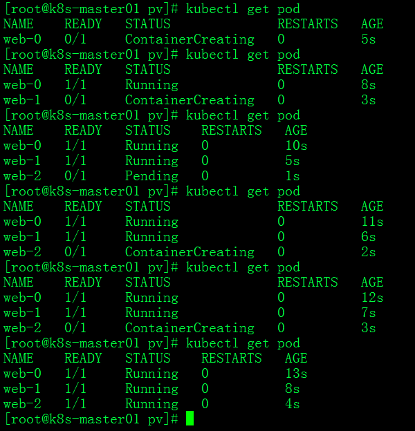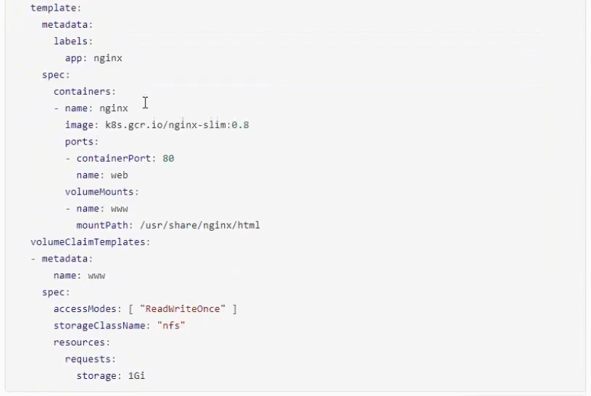 #vim pod.yaml apiVersion: v1 kind: Service metadata: name: nginx #无头服务名 labels: app: nginx spec: ports: - port: 80 name: web clusterIP: None #无头服务 selector: app: nginx --- apiVersion: apps/v1 kind: StatefulSet metadata: name: web spec: selector: matchLabels: app: nginx serviceName: "nginx" #使用上面的无头服务名 replicas: 3 template: metadata: labels: app: nginx spec: containers: - name: nginx image: hub.atguigu.com/library/nginx:latest ports: - containerPort: 80 name: web volumeMounts: - name: www mountPath: /usr/share/nginx/html volumeClaimTemplates: - metadata: name: www spec: accessModes: [ "ReadWriteOnce" ] #这个指标是必须符合下面的篮框里面的值 storageClassName: "nfs" #这个指标必须是符合下面的篮框里面的值 resources: requests: storage: 1Gi #必须小于pvc里面定义的大小 #kubectl apply -f pod.yaml #kubectl get pod
