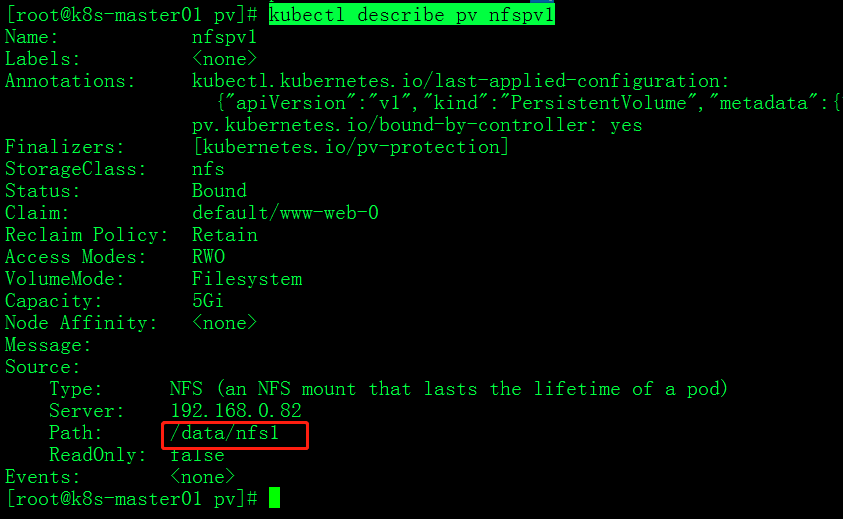 #kubectl describe pv nfspv1 #查看某个nfspv1挂载到barbor机器里面的哪个目录