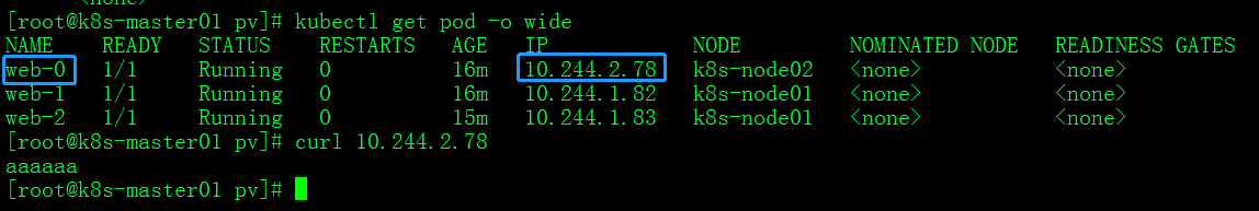 #kubectl delete pod web-0 #删掉pod web-0 #kubectl get pod -o wide #会自动重启,但是ip地址变了,服务名没有变