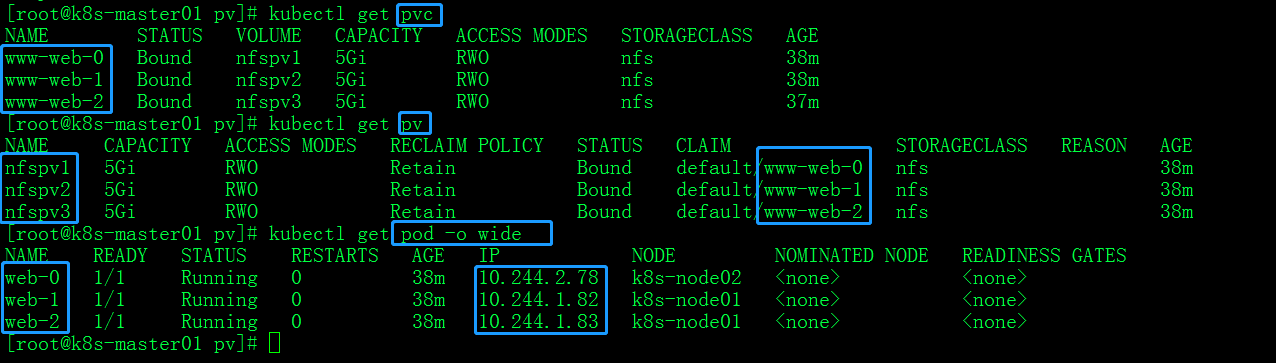 #kubectl get statefulset #kubectl delete statefulset --all #kubectl get svc #kubectl delete svc #kubectl get pod #kubectl delete pod --all #kubectl get pv nfspv1 -o yaml #查看谁在使用pv #kubectl edit pv nfspv1 #清除使用者 #kubectl get pv #kubectl delete pv --all #kubectl get pvc #kubectl delete pvc --all