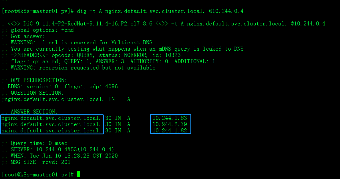 #kubectl get pod -o wide -n kube-system #dig -t A nginx.default.svc.cluster.local. @10.244.0.4