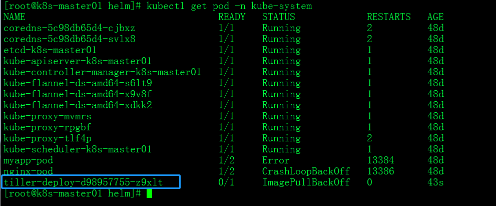 #kubectl describe pod tiller-deploy-d98957755-z9xlt -n kube-system #查看为啥tiller-deploy的pod没有成功,发现是tiller的image没有