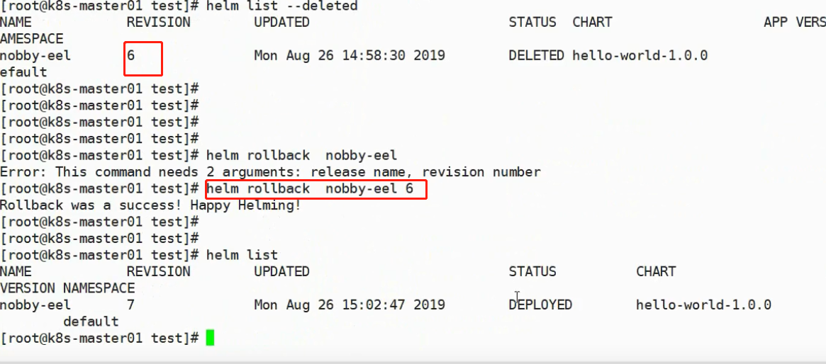 #helm delete nobby-eel #删除(其实没有被真正删掉) #helm ls --deleted #看到已经被删除helm #helm rollbak nobby-eel 6 #回滚指定名称和版本的helm #helm delete --purge nobby-eel #真正删除掉某一个helm