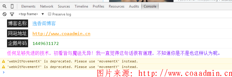 <!-- 控制台Console美化 --> <script> console.log("%c%c博客名称%c逸香阁博客","line-height:28px;","line-height:28px;padding:4px;background:#222;color:#fff;font-size:16px;margin-right:15px","color:#3fa9f5;line-height:28px;font-size:16px;"); console.log("%c%c网站地址%chttp://www.coaadmin.cn","line-height:28px;","line-height:28px;padding:4px;background:#222;color:#fff;font-size:16px;margin-right:15px","color:#ff9900;line-height:28px;font-size:16px;"); console.log("%c%c企鹅号码%c1449631172","line-height:28px;","line-height:28px;padding:4px;background:#222;color:#fff;font-size:16px;margin-right:15px","color:#008000;line-height:28px;font-size:16px;"); console.log("%c%c任何足够先进的技术,初看皆与魔法无异!我一直觉得这句话很有道理,不知道你是不是也这样认为呢。","line-height:28px;","line-height:28px;padding:4px 0px;color:#fff;font-size:16px;background-image:-webkit-gradient(linear,left top,right top,color-stop(0,#ff22ff),color-stop(1,#5500ff));color:transparent;-webkit-background-clip:text;"); </script>